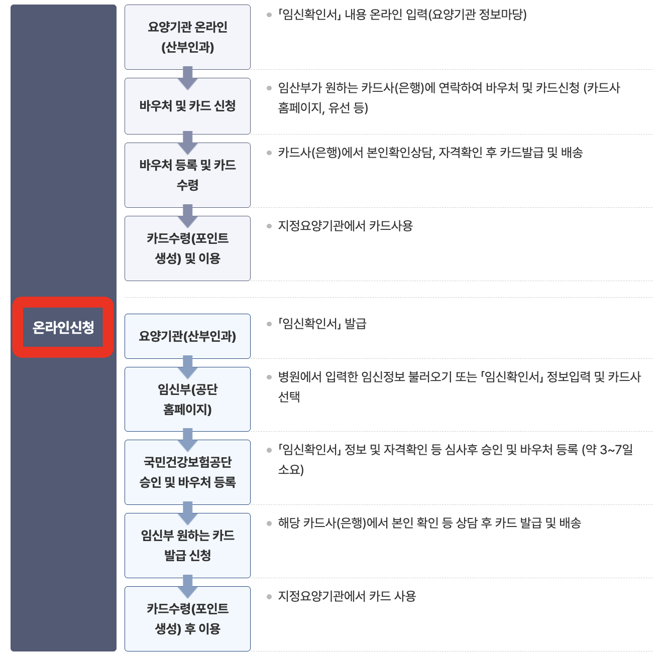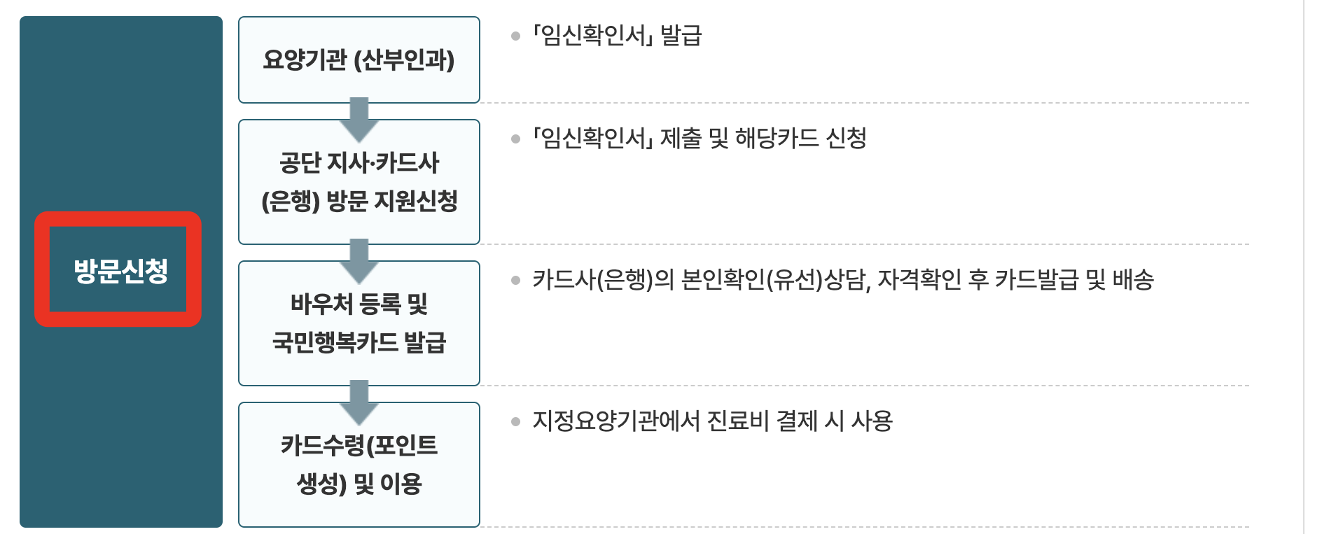 - 임신부가 카드사(BC, 롯데, 삼성, 국민, 신한) 홈페이지 또는 은행 방문 및 전화로 신청