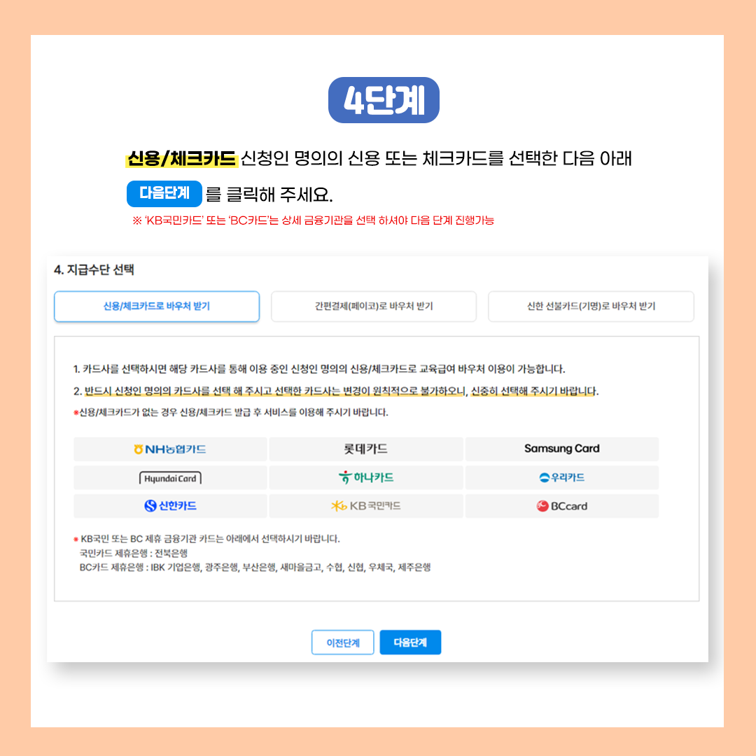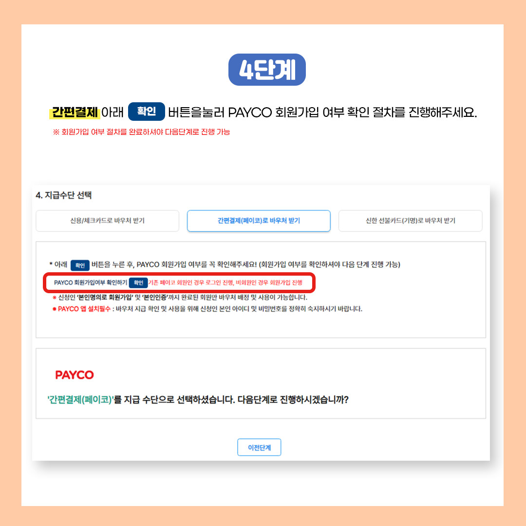 - 본인 확인 절차 후 지급수단(신용·체크카드, 간편결제, 선불카드 중 택1) 선택