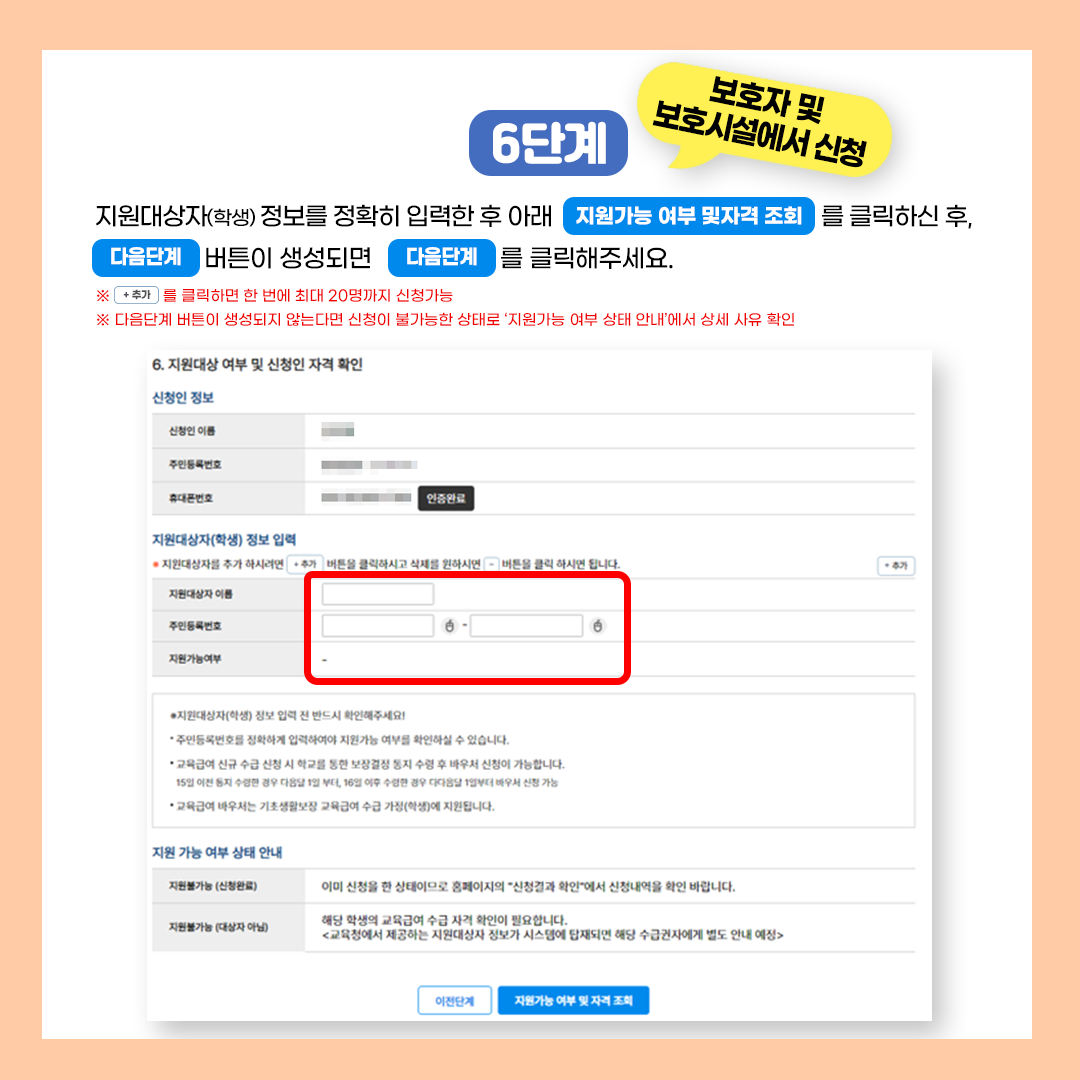 | 신청 가능자 | 만 14세 이상인 수급 학생 또는 해당 학생의 보호자(세대주, 세대원 등) |