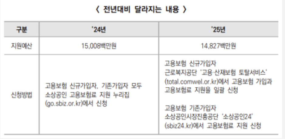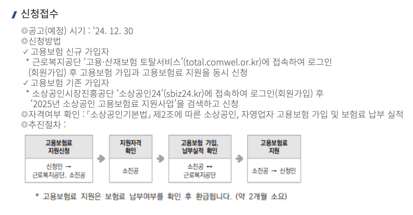 | 기존 가입자 | ‘소상공인24’ 홈페이지에서 로그인 후 ‘2025년 소상공인 고용보험료 지원사업’ 검색 후 신청 |
