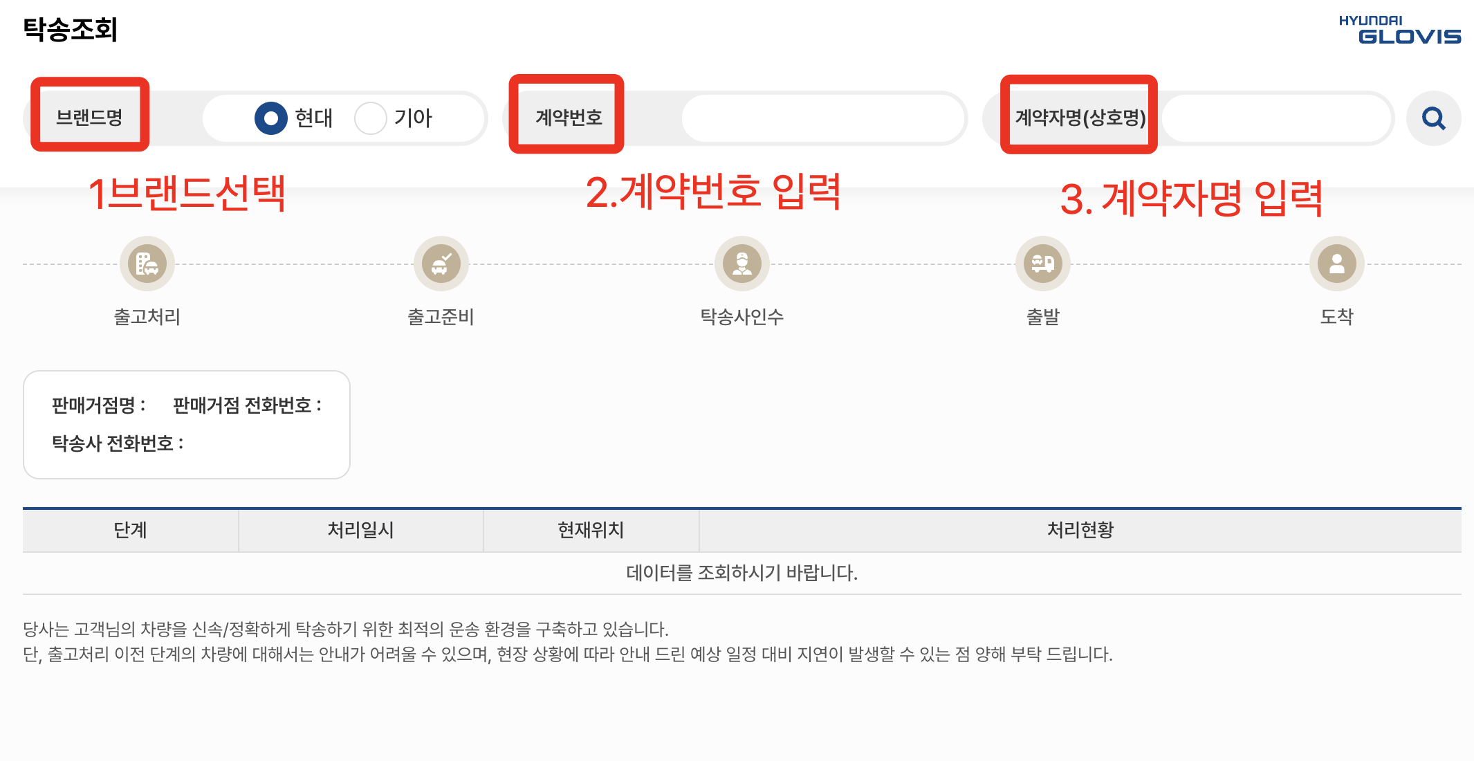 각 단계에서의 진행 상황은 현대글로비스 탁송 조회 시스템을 통해 확인할 수 있습니다.