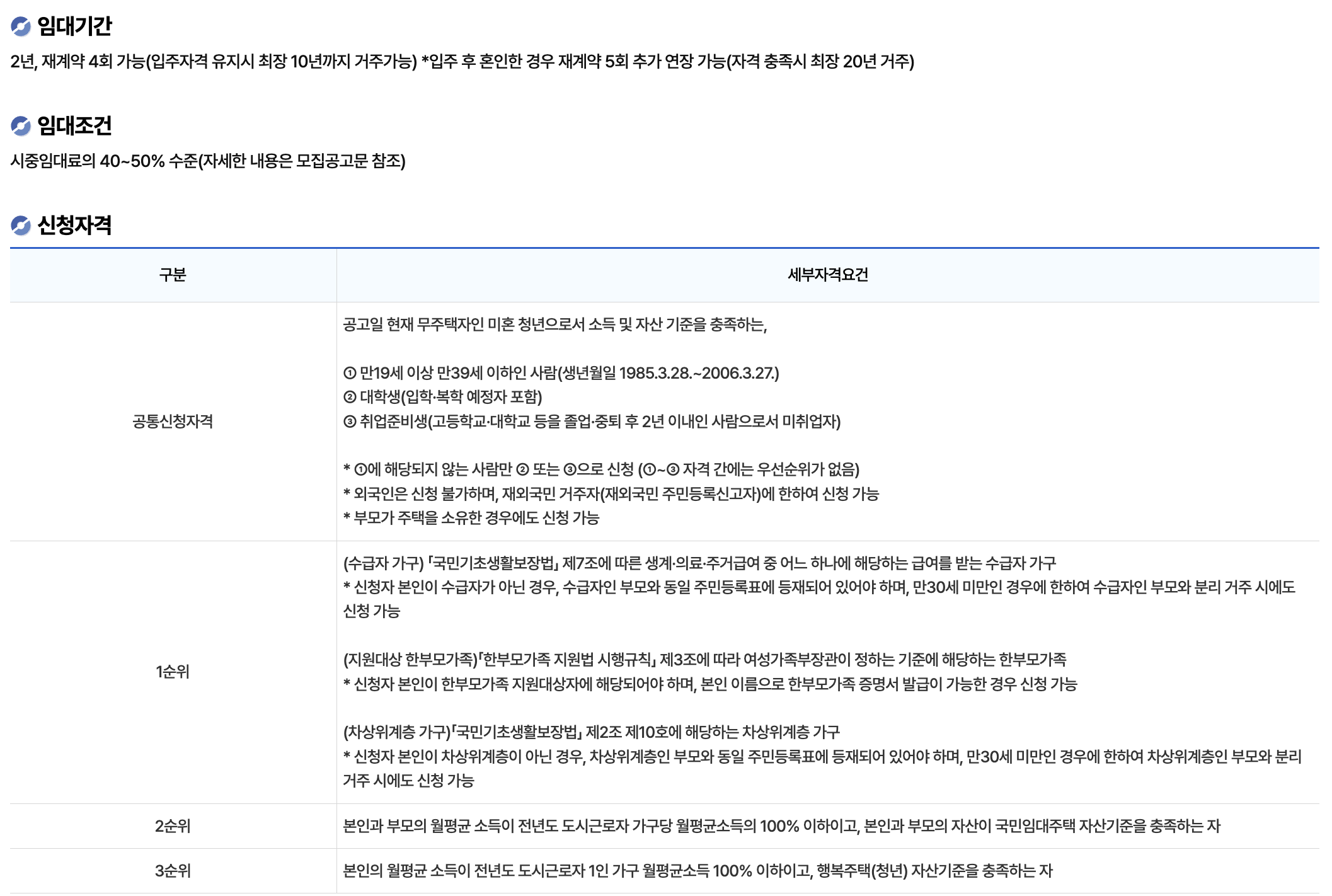 - 계약 기간: 2년 단위 갱신, 최장 10년 거주 가능 (혼인 시 최대 20년)