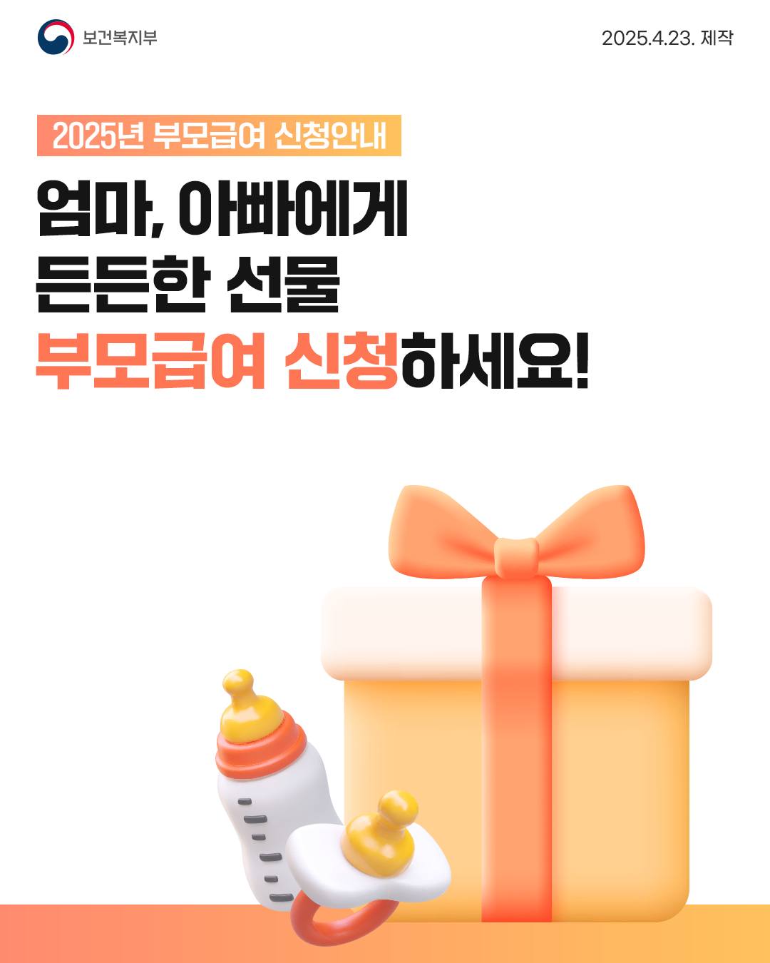 2025년 부모급여는 아이를 키우는 가정에게 큰 힘이 되는 복지 제도입니다. 특히 만 0세 아이를 둔 가정은 월 100만원이라는 적지 않은 금액을 지원받을 수 있어, 경제적 부담을 줄이는 데 도움이 됩니다.